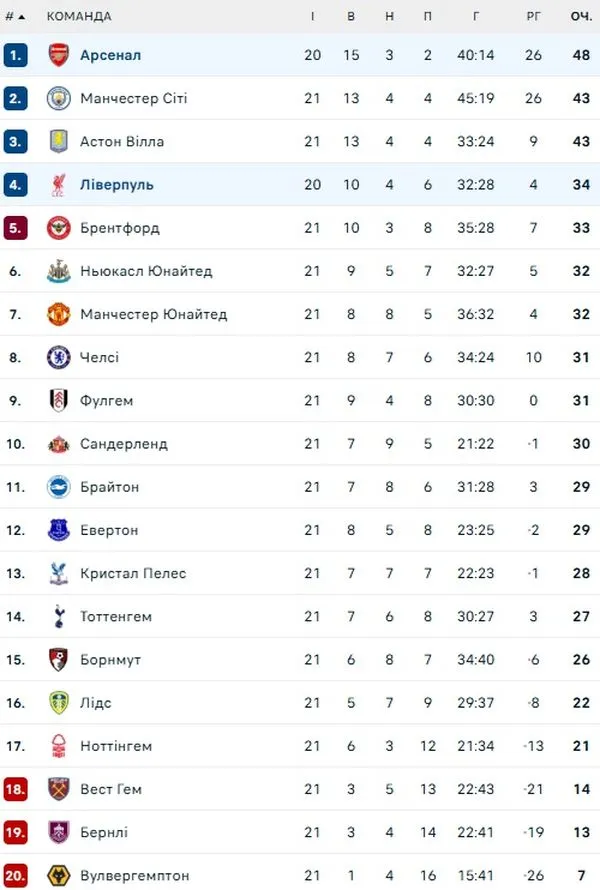 Арсенал лидирует в турнирной таблице АПЛ с 48 очками, Ливерпуль – четвертый, имея в своем активе 34 балла.