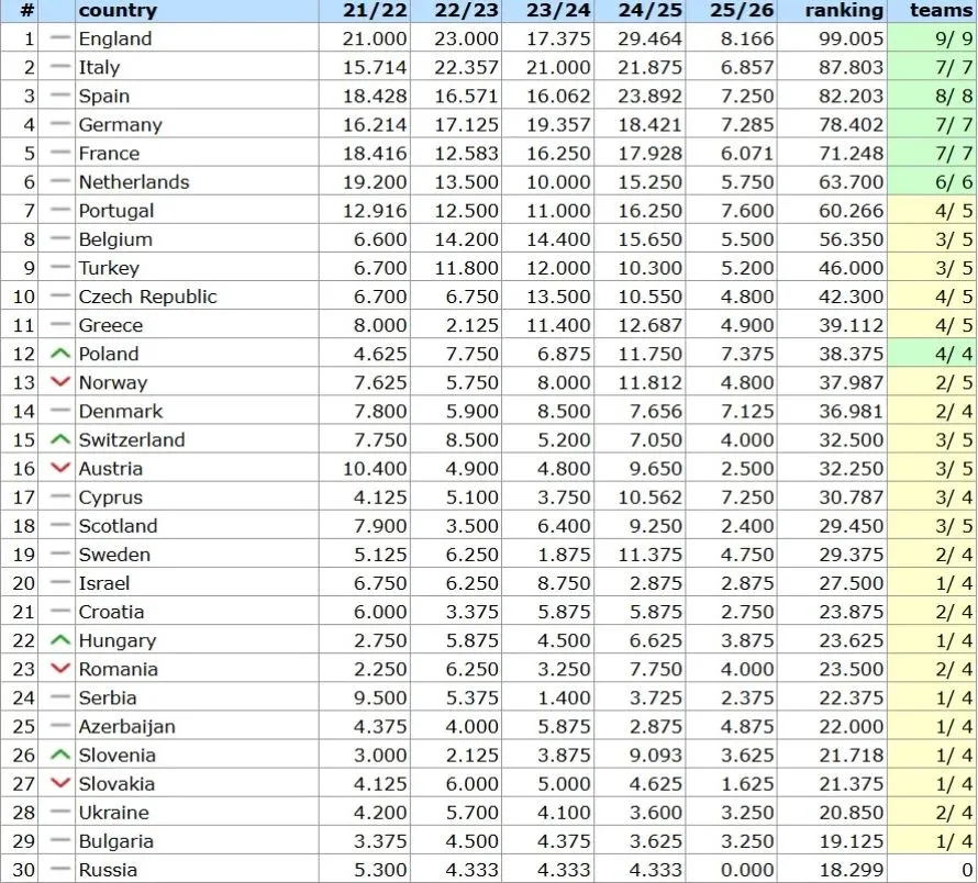 Если ситуация не изменится, и итоговое место Украины в рейтинге останется между 28 и 30, то с сезона 2027/28 чемпион страны будет стартовать в Лиге чемпионов не со второго, а с первого квалификационного раунда.