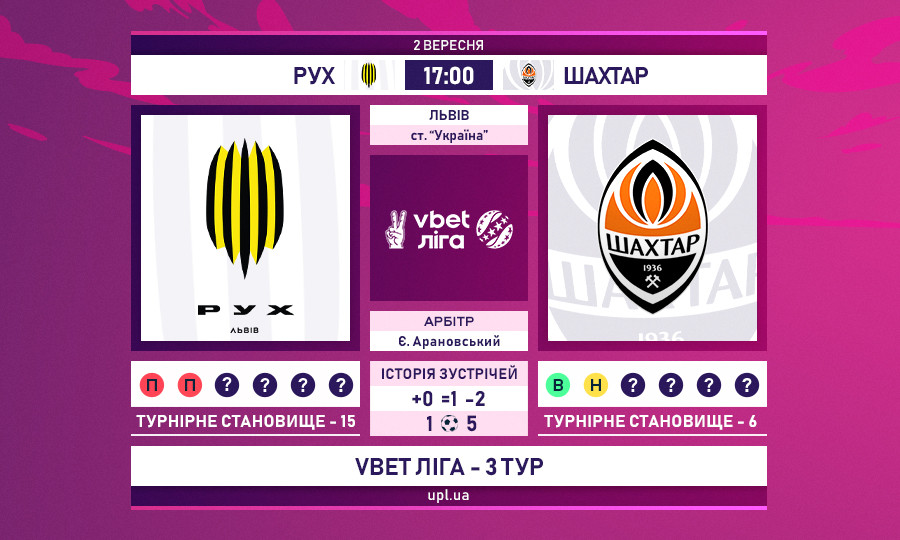 Третий тур УПЛ начинается там, где проходил самый длительный матч нынешнего сезона – напомним, именно во Львове из-за непрекращающихся сирен Рух и Металлист «играли» около 4,5 часов. Сейчас Рух готовится принимать команду, которая на момент вынужденной остановки прошлого сезона занимала первое место – 13-кратного чемпиона Украины, Шахтер.