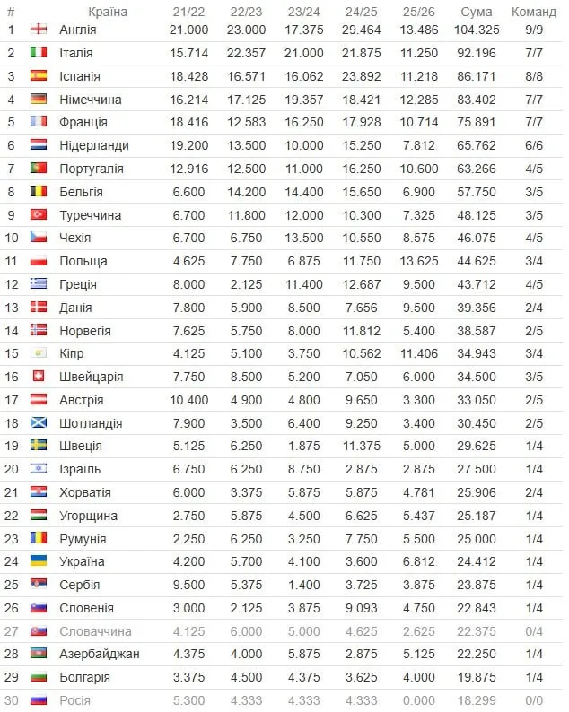 Таблиця коефіцієнтів УЄФА: Україна покращила свою позиції після матчів Динамо та Шахтаря